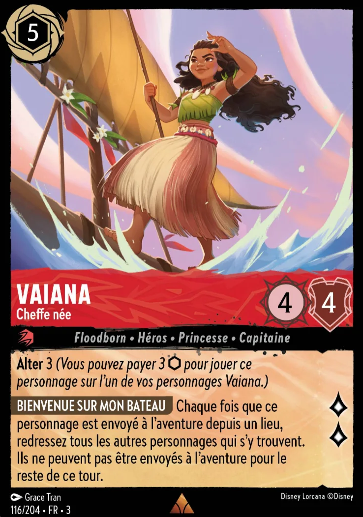 [Bienvenue sur mon bateau] Chaque fois que ce personnage est envoyé à l'aventure depuis un lieu, redressez tous les autres personnages qui s'y trouvent. Ils ne peuvent pas être envoyés à l'aventure pour le reste de ce tour.