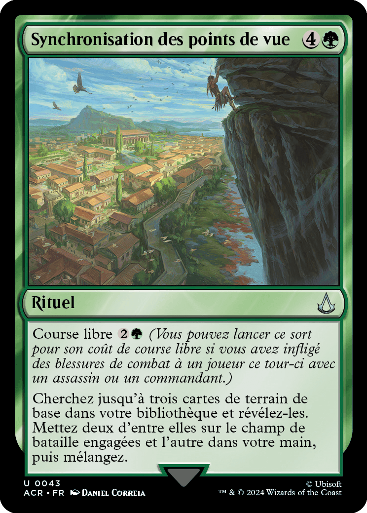 Cherchez jusqu'à trois cartes de terrain de base dans votre bibliothèque et révélez-les. Mettez deux d'entre elles sur le champ de bataille engagées et l'autre dans votre main, puis mélangez.