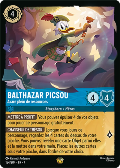 [Chasseur de trésor] Lorsque vous jouez ce personnage, regardez les 4 cartes du dessus de votre pioche. Vous pouvez révéler une carte Objet parmi elles et la mettre dans votre main. Placez les autres cartes sous votre pioche, dans l'ordre de votre choix.