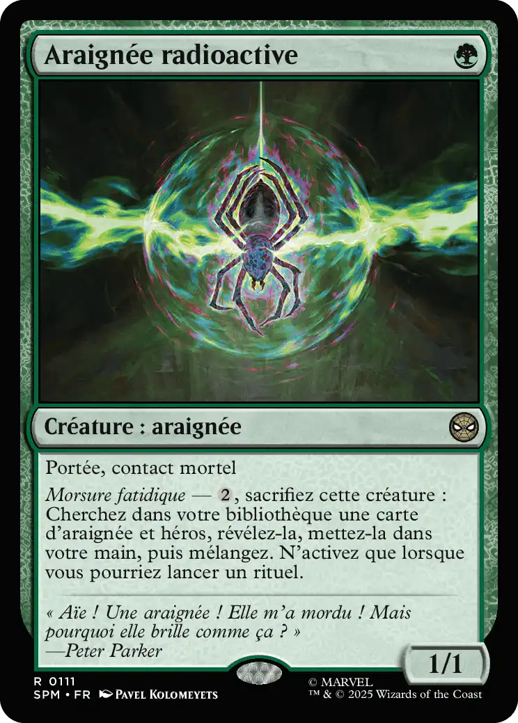Morsure fatidique — , sacrifiez cette créature : Cherchez dans votre bibliothèque une carte d'araignée et héros, révélez-la, mettez-la dans votre main, puis mélangez. N'activez que lorsque vous pourriez lancer un rituel.