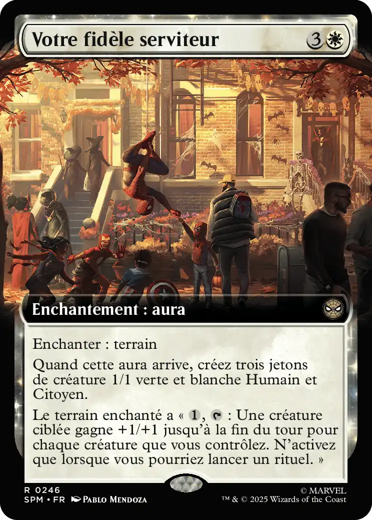 Quand cette aura arrive, créez trois jetons de créature 1/1 verte et blanche Humain et Citoyen.
