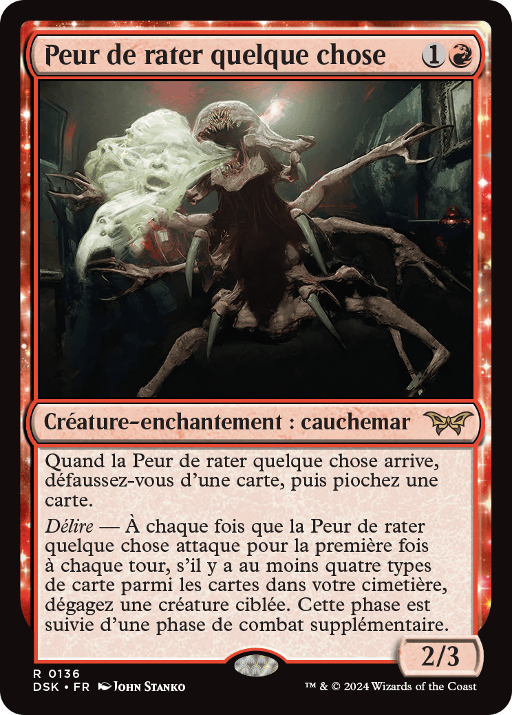 Délire — À chaque fois que la Peur de rater quelque chose attaque pour la première fois à chaque tour, s'il y a au moins quatre types de carte parmi les cartes dans votre cimetière, dégagez une créature ciblée. Cette phase est suivie d'une phase de combat supplémentaire.