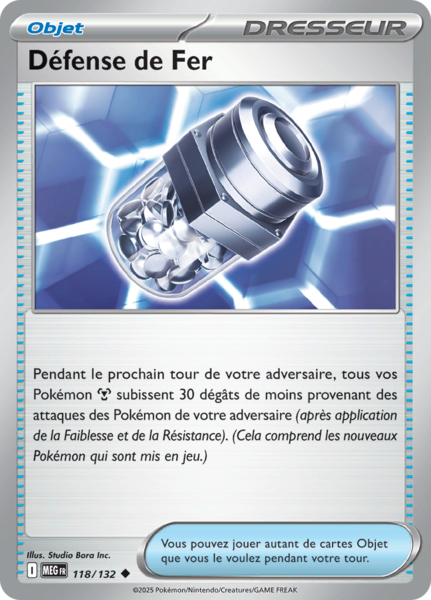 Pendant le prochain tour de votre adversaire, tous vos Pokémon Métal subissent 30 dégâts de moins provenant des attaques des Pokémon de votre adversaire (après application de la Faiblesse et de la Résistance). (Cela comprend les nouveaux Pokémon qui sont mis en jeu.)