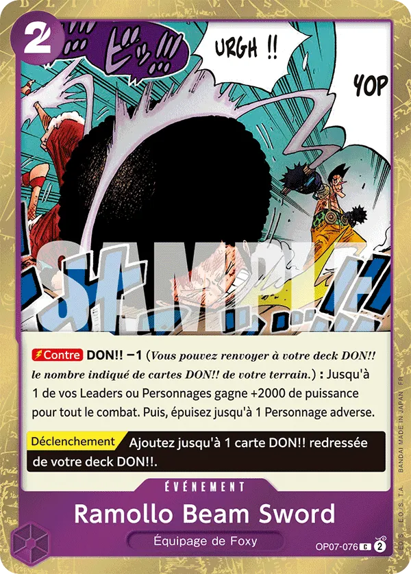 [Contre] DON!! −1 (Vous pouvez renvoyer à votre deck DON!! le nombre indiqué de cartes DON!! de votre terrain.) : Jusqu'à 1 de vos Leaders ou Personnages gagne +2000 de puissance pour tout le combat. Puis, épuisez jusqu'à 1 Personnage adverse.