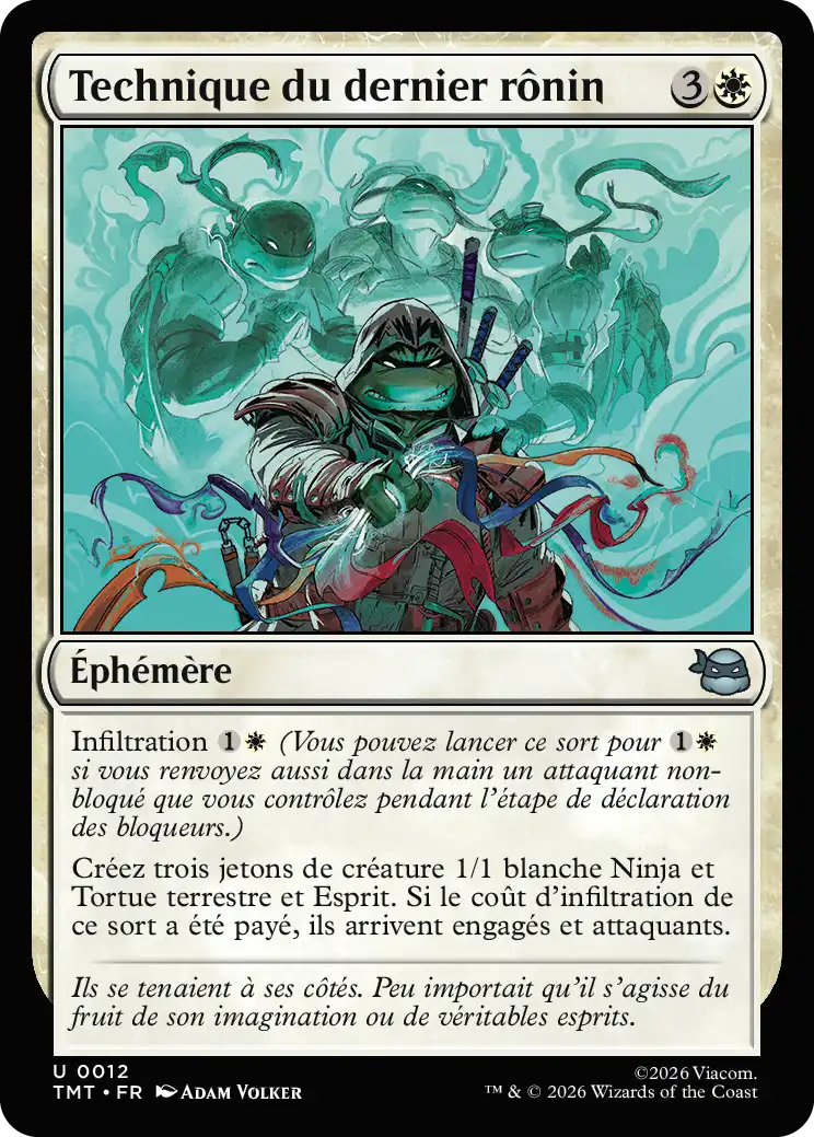 si vous renvoyez aussi dans la main un attaquant non-bloqué que vous contrôlez pendant l'étape de déclaration des bloqueurs.)Créez trois jetons de créature 1/1 blanche Ninja et Tortue terrestre et Esprit. Si le coût d'infiltration de ce sort a été payé, ils arrivent engagés et attaquants.